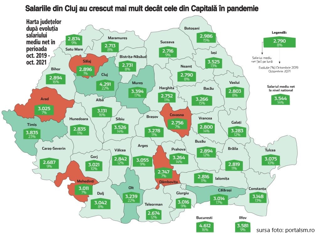 Clasamentul din nord-vestul țării este condus de Cluj, cu un salariu mediu net de 4 291 lei, înregistrând o creștere de 22% în perioada octombrie 2019 – octombrie 2021.
